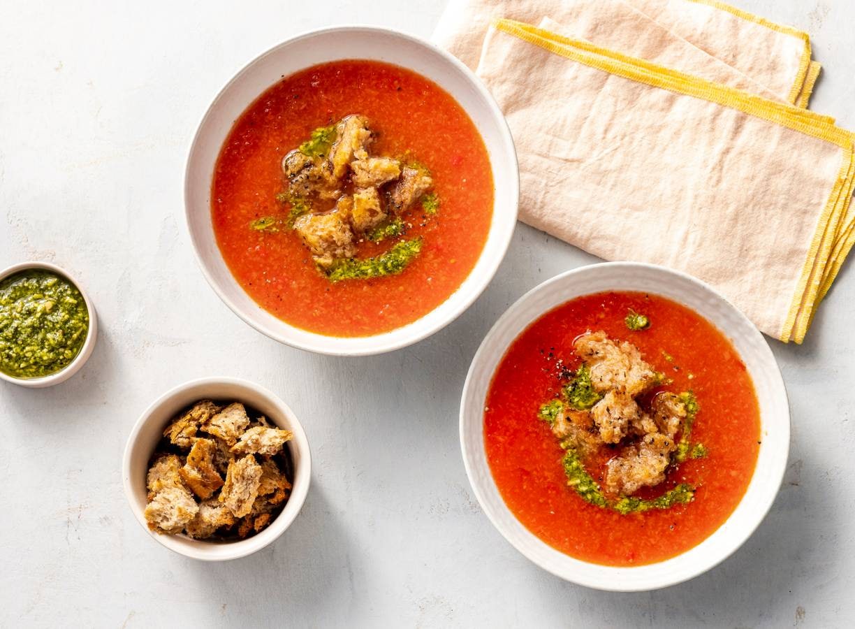 Maak je paprika-tomatensoep af met knapperige knoflookcroutons en geitenkaaspesto. Soeperlekker!