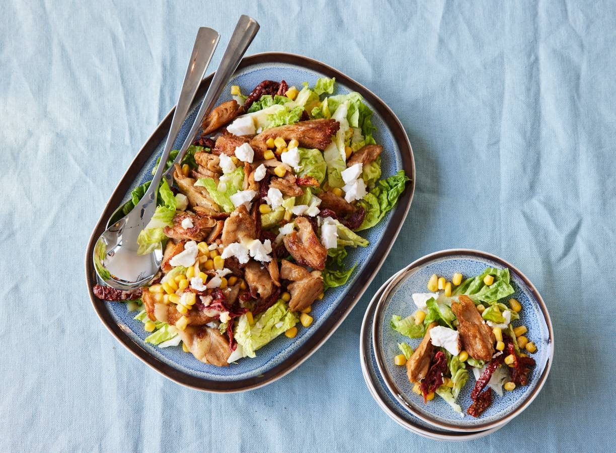Meng de babyromaine, mais, zongedroogde tomaat en kipstuckjes door de dressing. Verkruimel het alternatief voor witte Griekse kaas erboven en serveer.