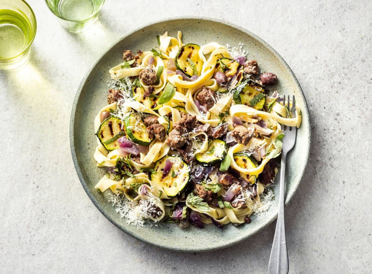 Tagliatelle met gegrilde courgette, worst en Parmezaan