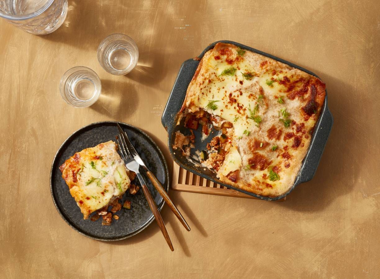 Maak zo nog 2 lagen. Verdeel de rest van de bechamel erover en leg de mozzarellaplakjes erop. Bak de lasagne in ca. 40 min. in het midden van de oven goudbruin en gaar.