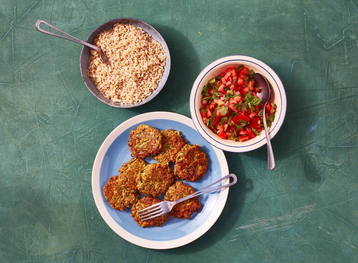 Serveer de viskoekjes met de rijst en tomatensalade.