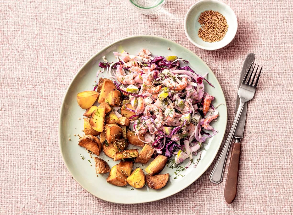 Gezonde koolsalade met rivierkreeftjes, dille-yoghurtdressing en aardappel