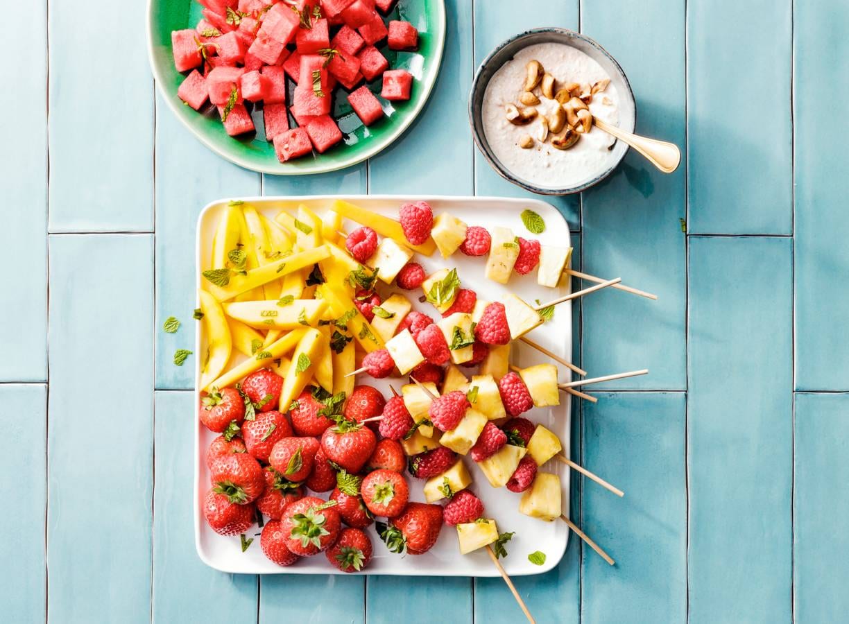 Haal de blaadjes van de takjes munt en snijd fijn. Verdeel de watermeloen, aardbeien, mango en fruitprikkers over een serveerschaal en garneer met de munt. Serveer met de cashewdip.