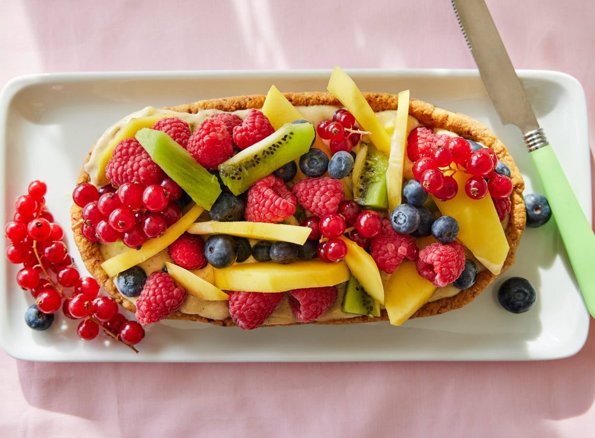 Verdeel de custard over de amandelspijs en verdeel het fruit erover.