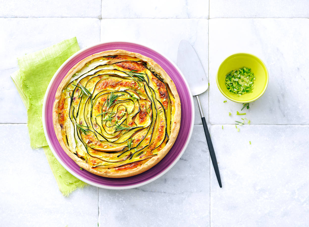 Quiche is altijd goed! Bijvoorbeeld deze courgettequiche met kaas en bieslook.