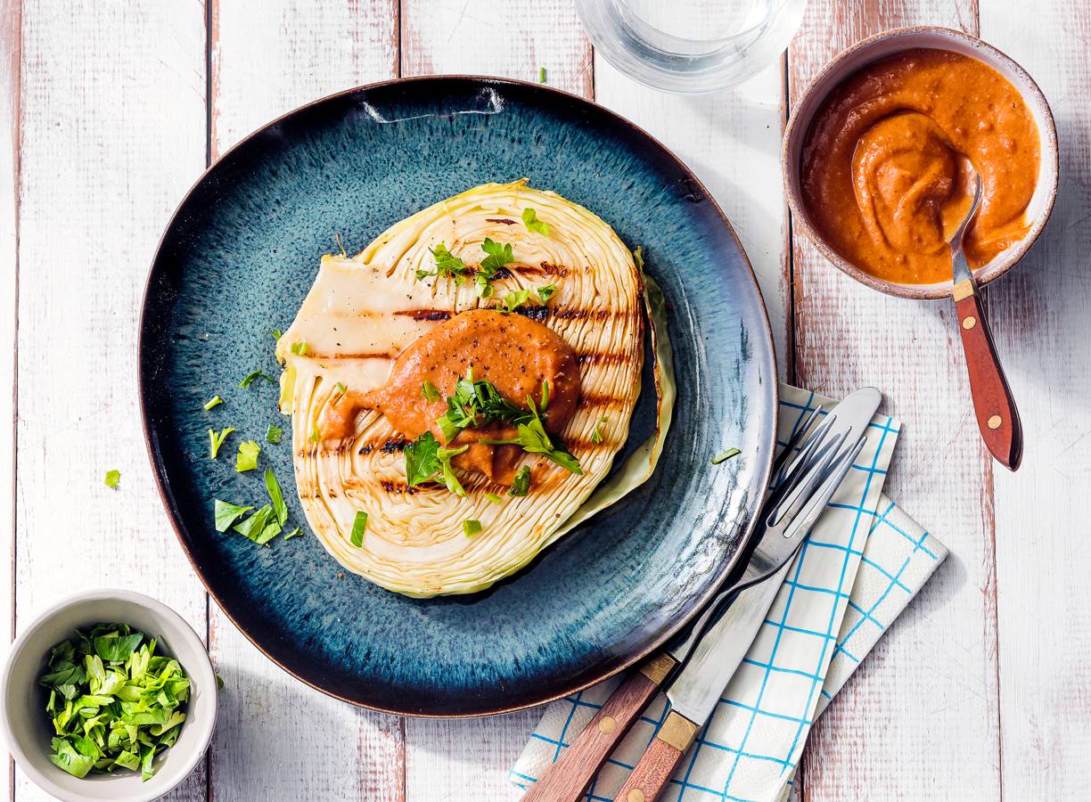 Een lekkere steak... van witte kool! Maar de pittige miso-pindasaus is de echte ster van dit BBQ gerecht!