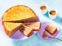 5. Schep 100 ml licht beslag in de springvorm. Verdeel het beslag goed over de gehele bodem van de springvorm en bak 4 min. in het midden van de oven. Haal de springvorm uit de oven en schep er 100 ml donker beslag in en verdeel het beslag goed, bak 5 min. in het midden van de oven. Herhaal tot het beslag op is, je moet dan 16 lagen hebben.