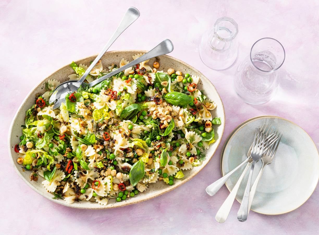Kom maar door, zon! Deze pastasalade is vegan en zit vol zonnige toppers: doperwten, basilicum, rode peper, hazelnoten en baby romaine.