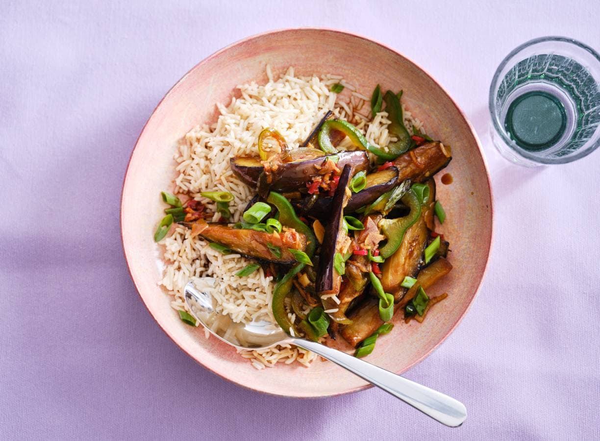 Kook de rijst volgens de aanwijzingen op de verpakking. Snijd ondertussen de aubergines in de lengte in 8 parten en halveer deze in de breedte. Verwijder de steelaanzet van de paprika, halveer in de lengte, verwijder de zaadlijsten en snijd het vruchtvlees in dunne halve ringen Verhit ⅔ van de olie in een wok en roerbak de aubergine en paprika 10 min. op middelhoog vuur.