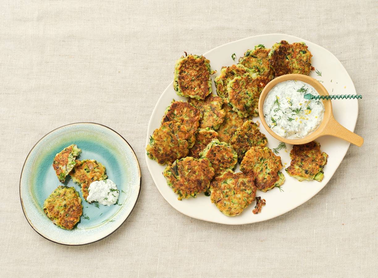 In Griekenland weten ze wel hoe je moet snacken. Deze hartige courgettekoekjes met feta, groene kruiden en een dip van tzatziki kun je de hele dag wel eten!