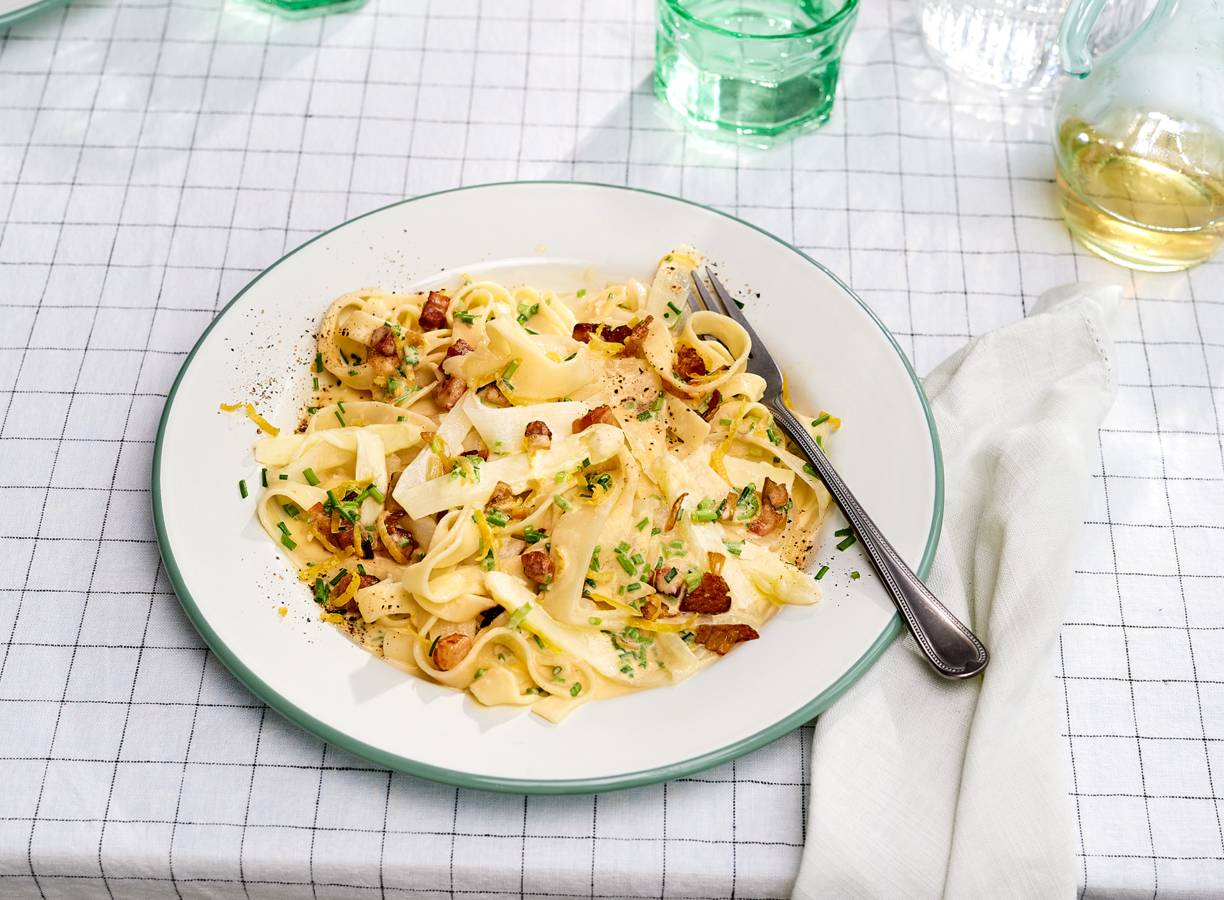 Giet de pasta af, bewaar 100 ml van het kookvocht (per 4 personen) en doe de pasta snel terug in de nog hete pan. Meng de pancetta, het ei-roommengsel, kookvocht, citroenrasp en de helft van de bieslook erdoor. Breng op smaak met 1 el citroensap (per 4 personen), peper en eventueel zout. Bestrooi met de rest van de bieslook en serveer direct.
