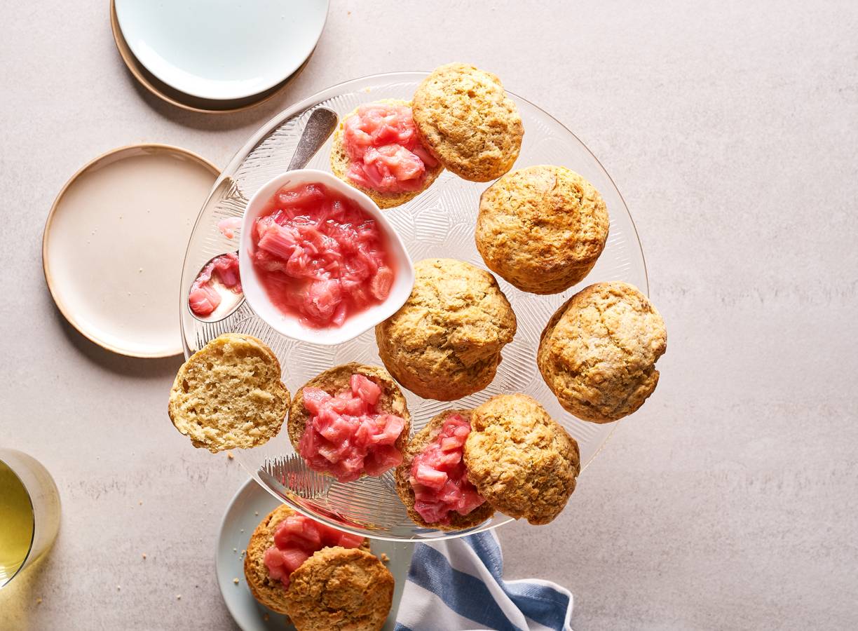 De zoete scones met de friszure rabarbercompote zijn de perfecte partners.