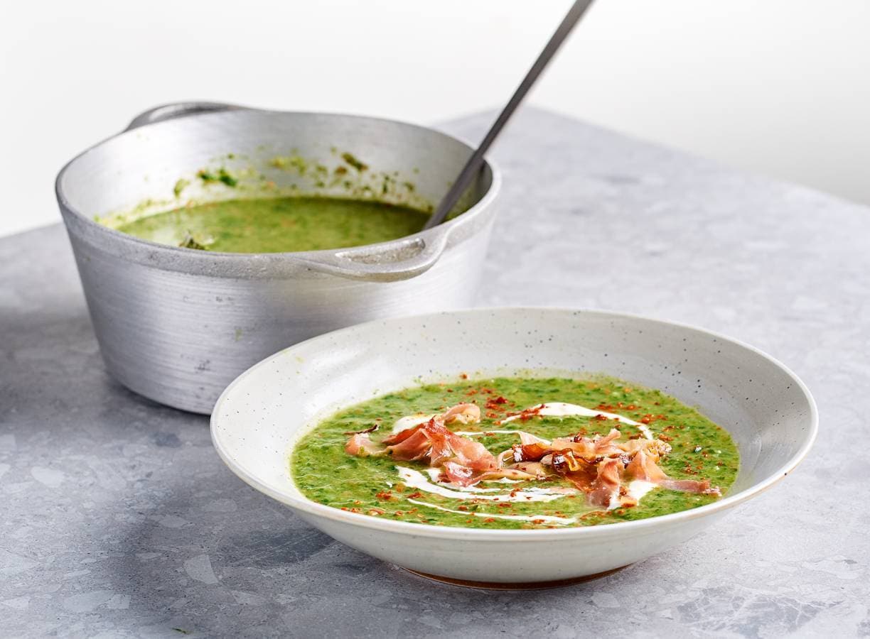 Deze groene lentesoep met spinazie is lekker romig en toppen we af met knapperige Coburger ham.