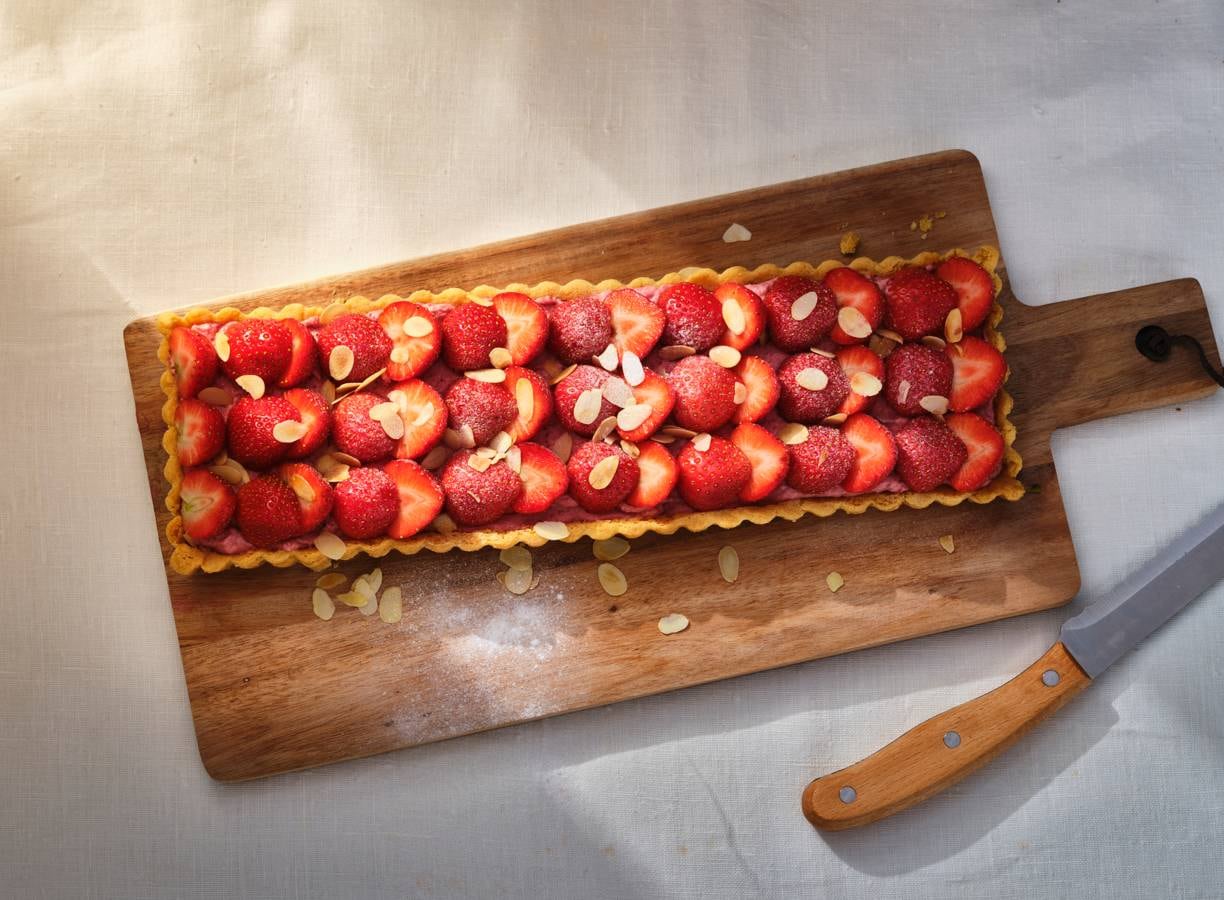Deze zomerse aardbeientaart maak je met geroosterde amandelen en frangipane voor onweerstaanbare amandelsmaken.