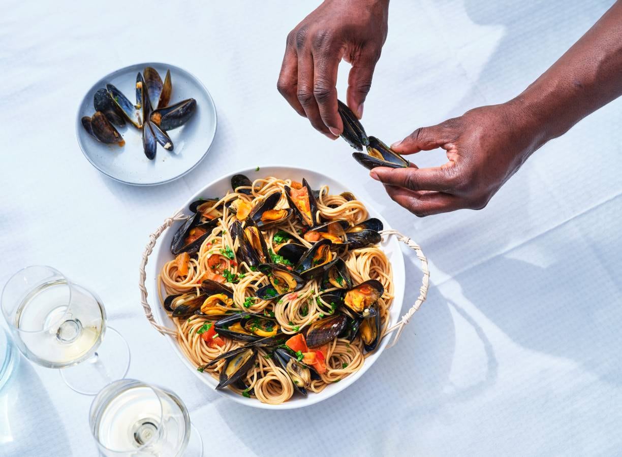 Een pasta vol pure zomerse smaken van mosselen, verse tomaten en kruiden.