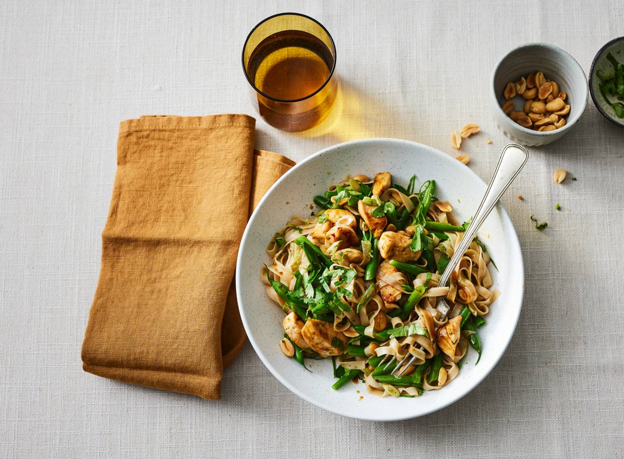 Meng de rest van de dressing met de noedels, sperziebonen, kip, koriander, ¾ van de bosui en ¾ van de pinda’s. Verdeel de noedels over kommen en bestrooi met de rest van de pinda’s en de rest van de bosui.