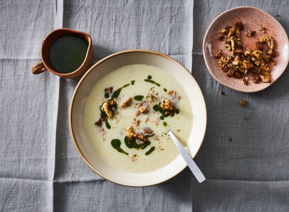 Romige wortelpeterseliesoep met kruidenolie en walnoten