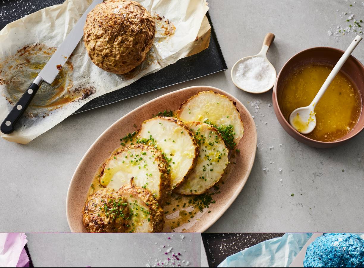 Een pronkstuk op tafel: in zijn geheel geroosterde knolselderij. Botersaus erover en het diner kan beginnen!