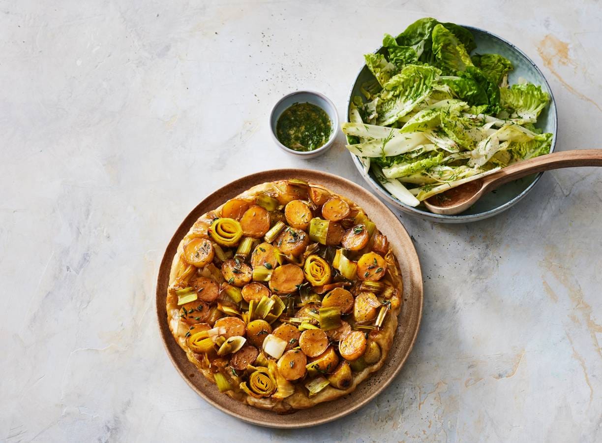 Een hartige taart, maar dan op z’n kop! Deze tarte tatin is fantastisch, met prei, tijm en krieltjes als sterren van het gerecht.