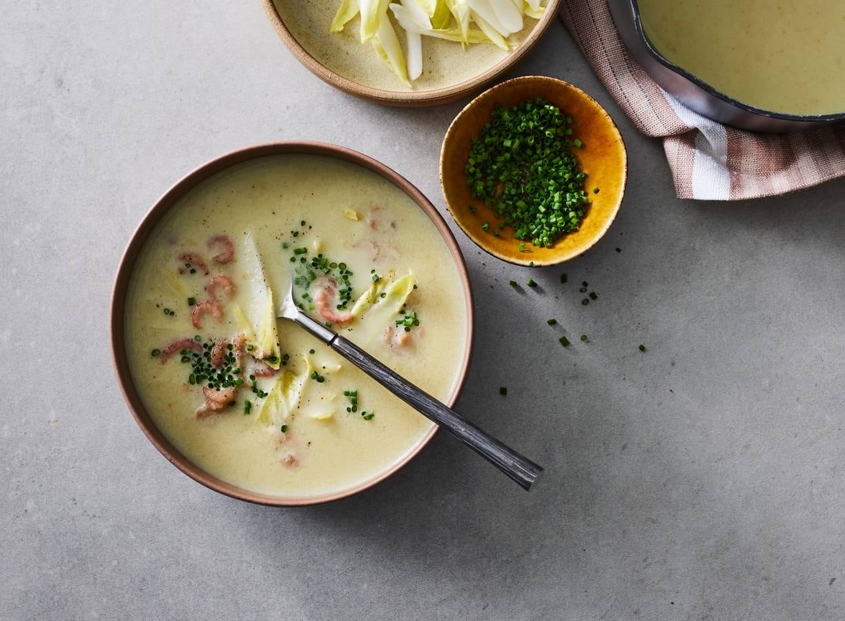 Je blijft je kom vullen met deze witlofsoep. Zal ook iets te maken hebben met de Hollandse garnalen als feestelijke topping.