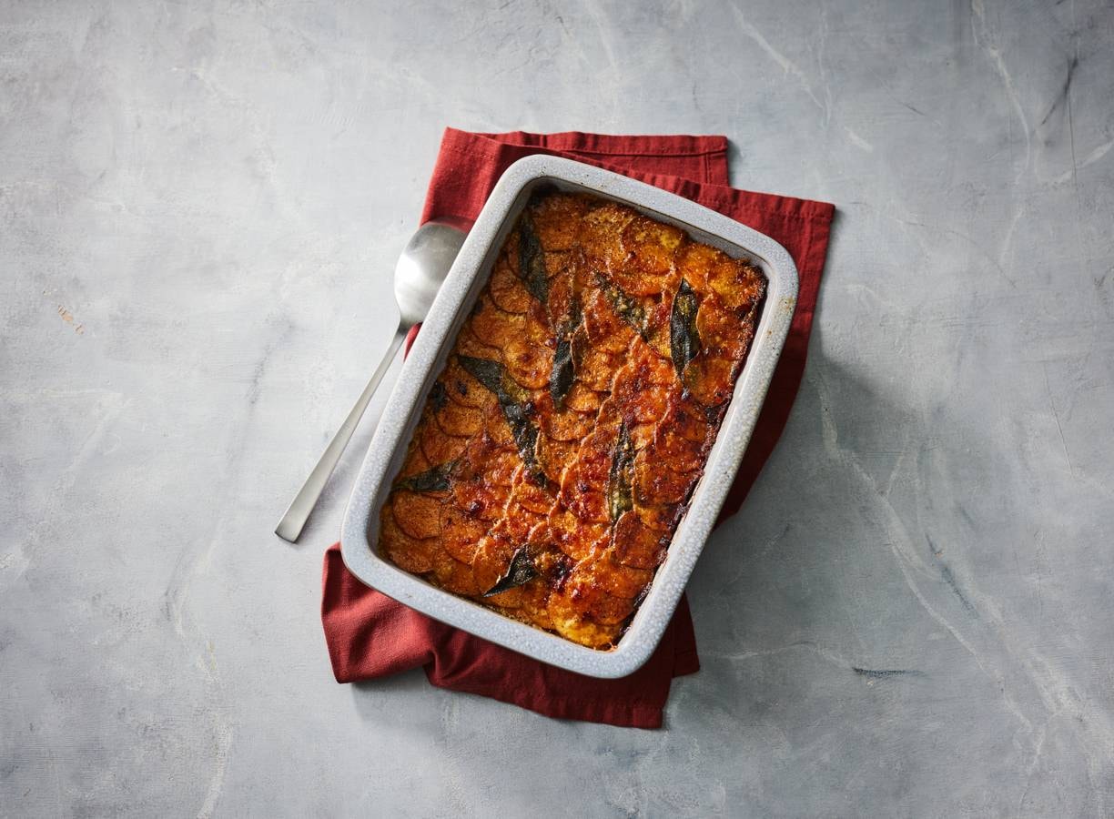 Maak je aardappelgratin eens met zoete aardappels, Zwitserse gruyère en salieroom. Een nieuwe klassieker in de dop!