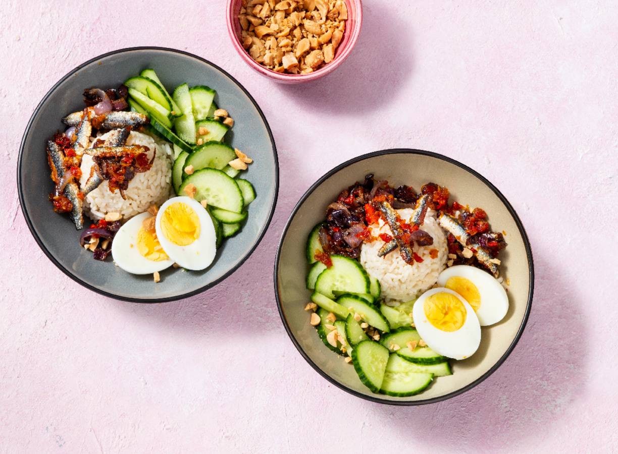 achtergrondinfo:Nasi Lemak is het nationale ontbijtgerecht van Maleisië. Meestal bestaat het gerecht uit rijst gekookt in kokosmelk met pandanblad of sereh en sambal Ikan Bilis – sambal met gedroogde ansjovis. In dit recept drogen we de ansjovis zelf. Verder zit er vaak een gekookt ei, pinda’s en frisse komkommer bij.