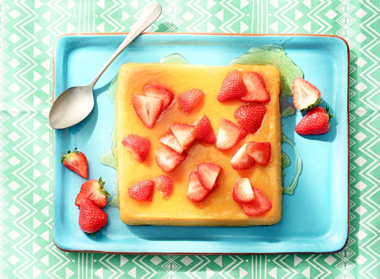 bereidingstip:Je kunt de flan de coco 2 dagen van tevoren maken. Bewaar in de koelkast tot gebruik en garneer pas vlak voor serveren met de plakjes aardbei.