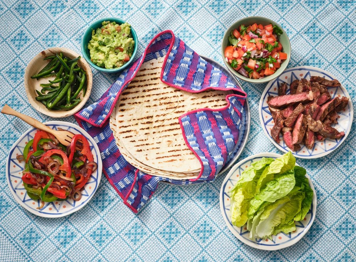 Verwarm de tortilla’s 1 min. in de grillpan zonder olie of boter, keer halverwege. Hou warm in een schone theedoek. Snijd ondertussen de steaks in repen van ca. 1 cm.
