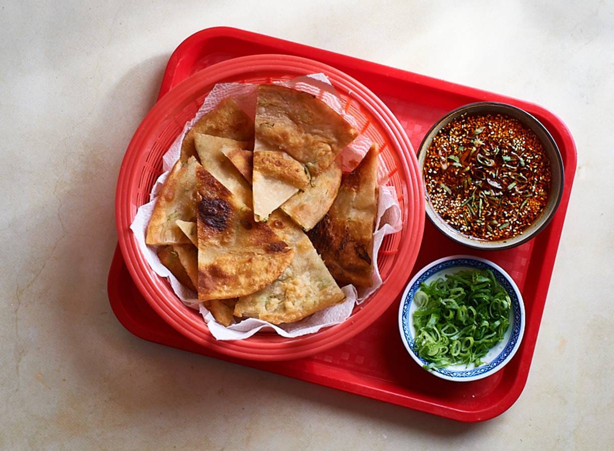 Emma's scallion pancakes (cong you bing) zijn knapperig vanbuiten en chewy vanbinnen, met veel laagjes. Het zijn eigenlijk geen pannenkoekjes, maar brood, want je maakt het op basis van deeg. Lekker met een dip van sojasaus, rijstazijn en sesamolie.