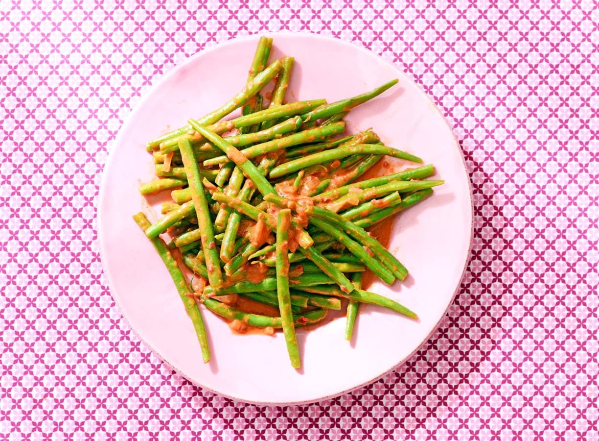 Sperzieboontjes met smaken uit Indonesië: deze sambal goreng buncis doen het heel goed als onderdeel van een rijsttafel. Dit is het recept van Laura, die het weer leerde van haar tante Erna.