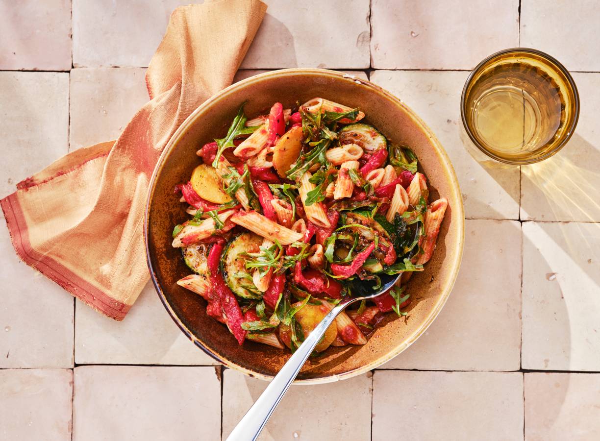 Geroosterde paprika en een goede pastasaus zijn 't geheim voor deze lekkere, snelle en makkelijke pasta.