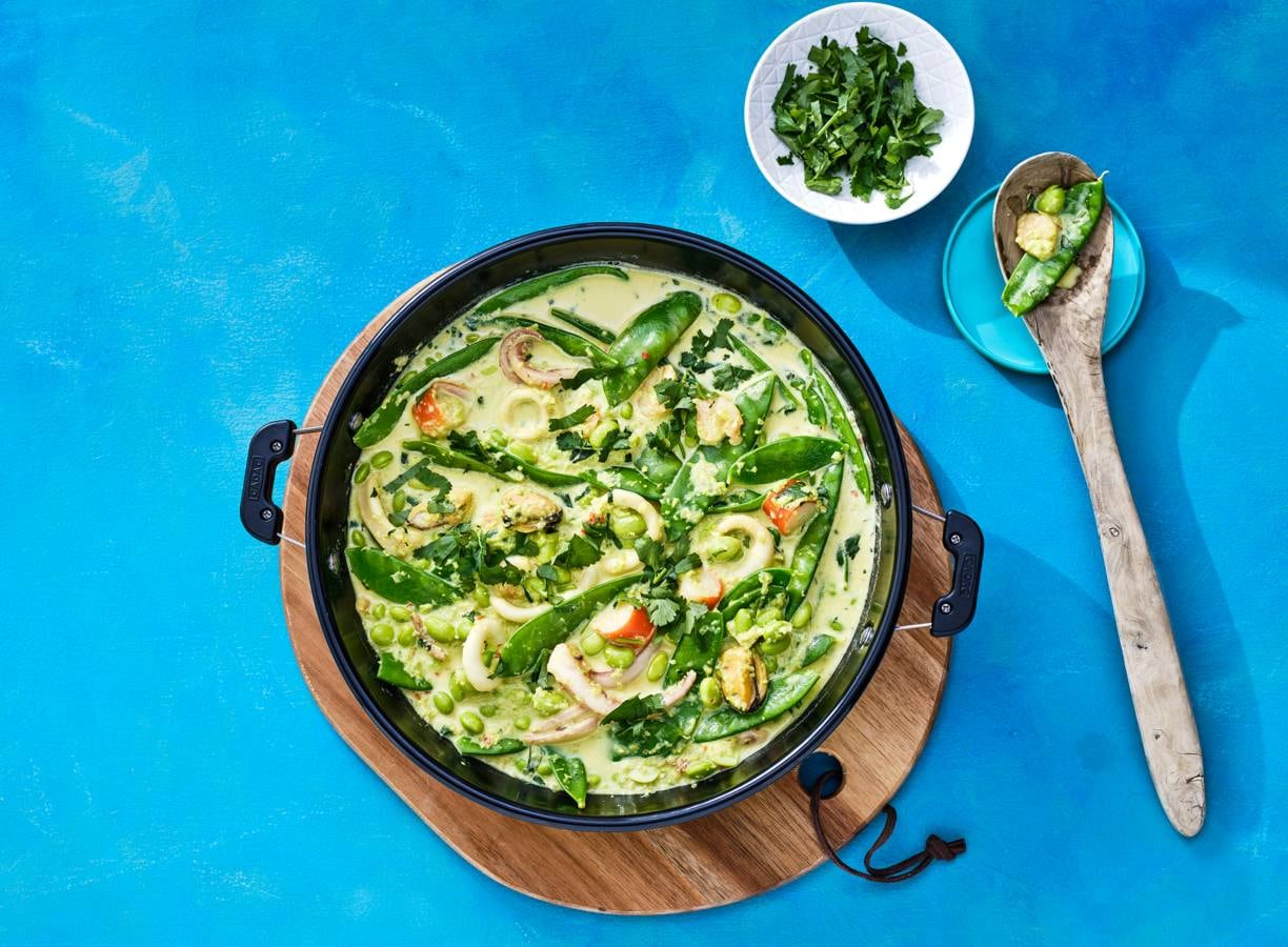 Dit visstoofpotje heeft Aziatische invloeden met sereh, limoen, rode peper en edamame boontjes!