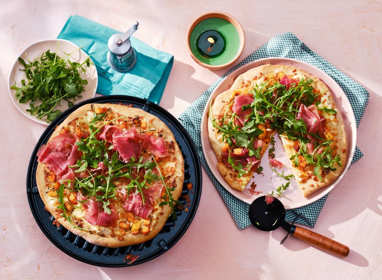Skottelbraai pizza bianca met pompoen en rauwe ham
