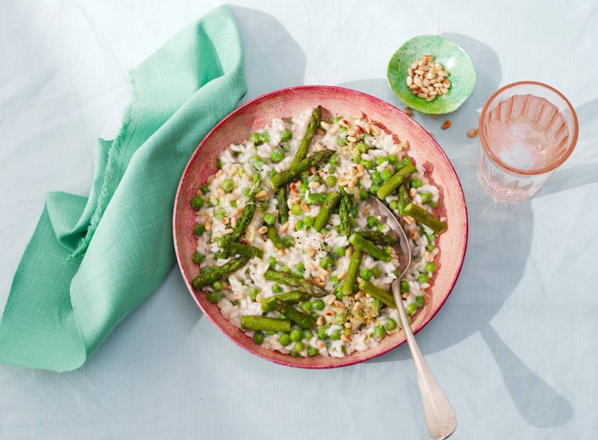 Verdeel de risotto over diepe borden en schep de gebakken asperges erop. Bestrooi met het citroenrasp en de pijnboompitten.