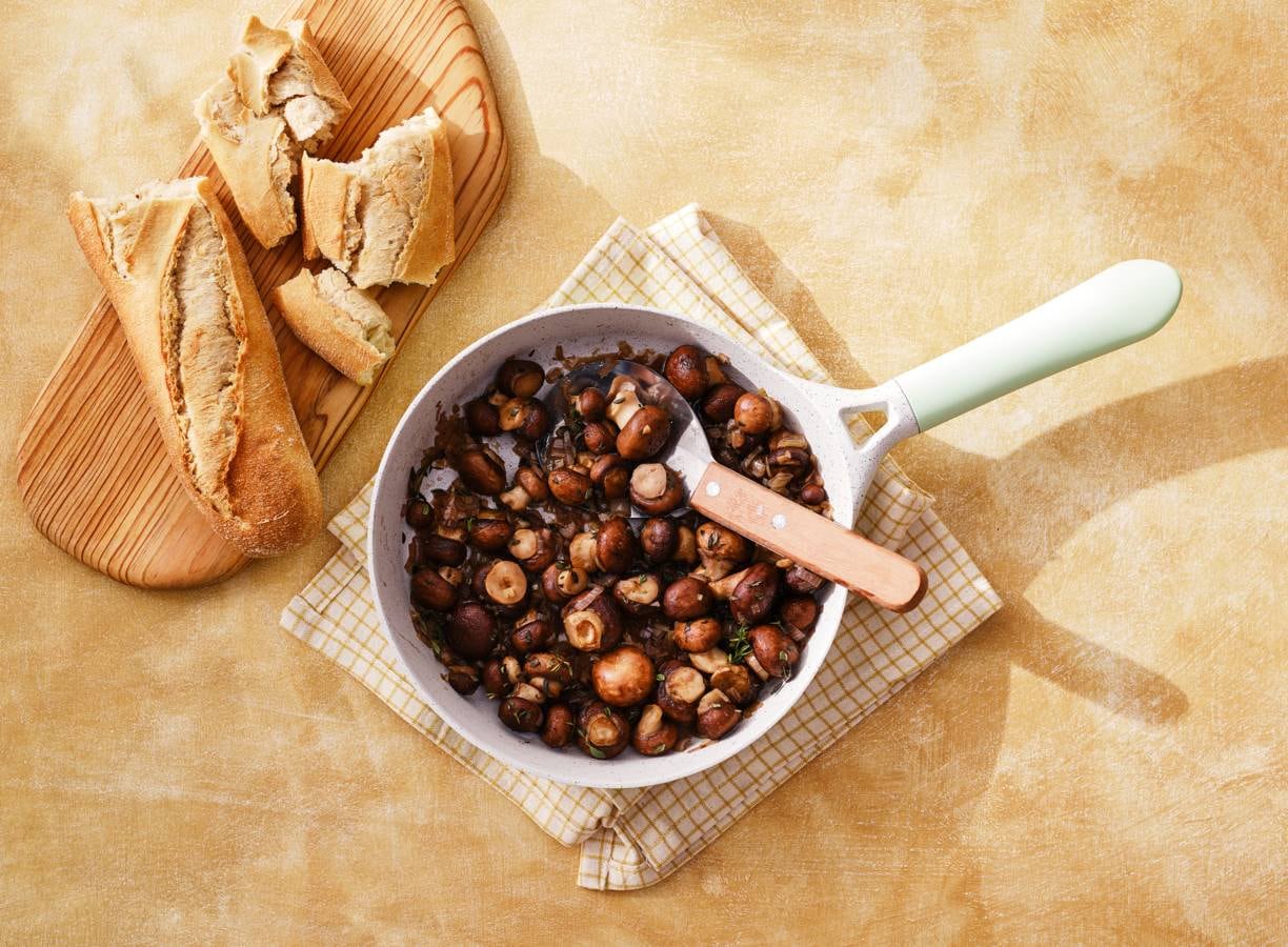 Borstel de champignons schoon, snijd eventueel de harde stelen eraf. Verhit een hapjespan op middelhoog vuur, zonder olie of boter en bak de champignons 5 min. Schep af en toe om.