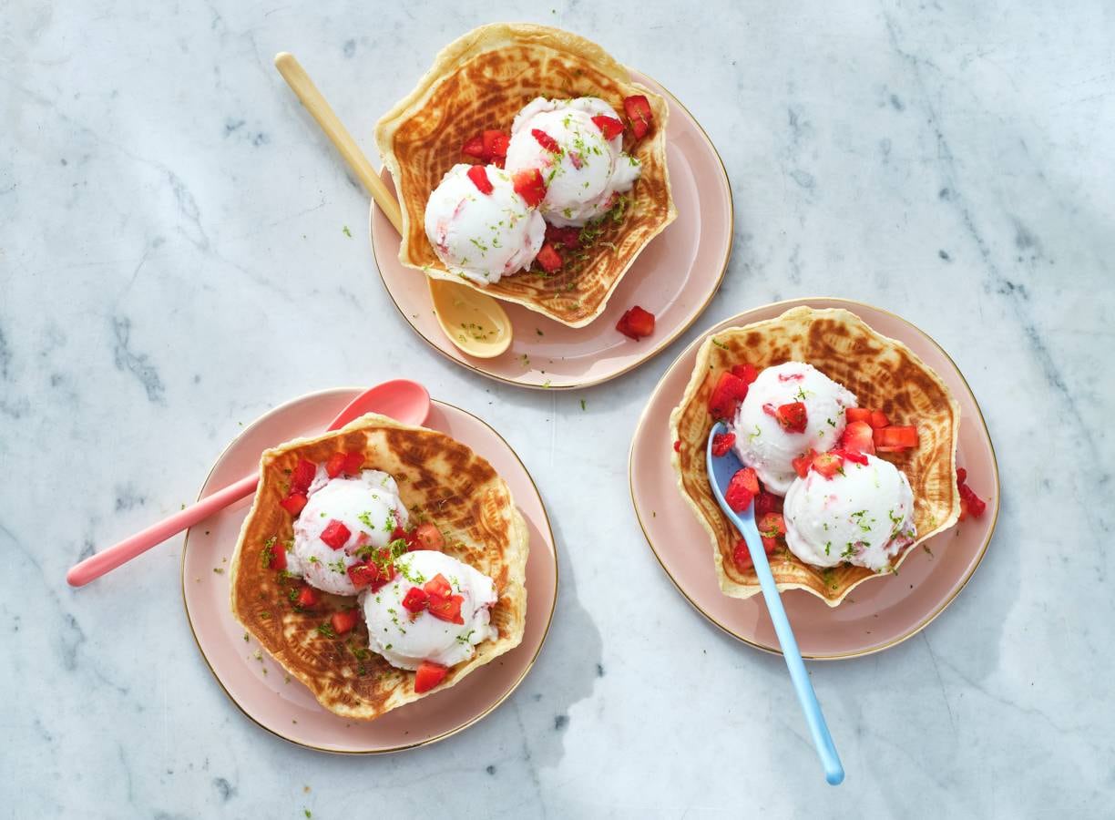 IJs maken zonder ijs? Dit aardbeienijs met geheim ingrediënt anijs bewijst dat het kan. En als je dat serveert in een zelfgemaakt oubliebakje heb je een spectaculair dessert.