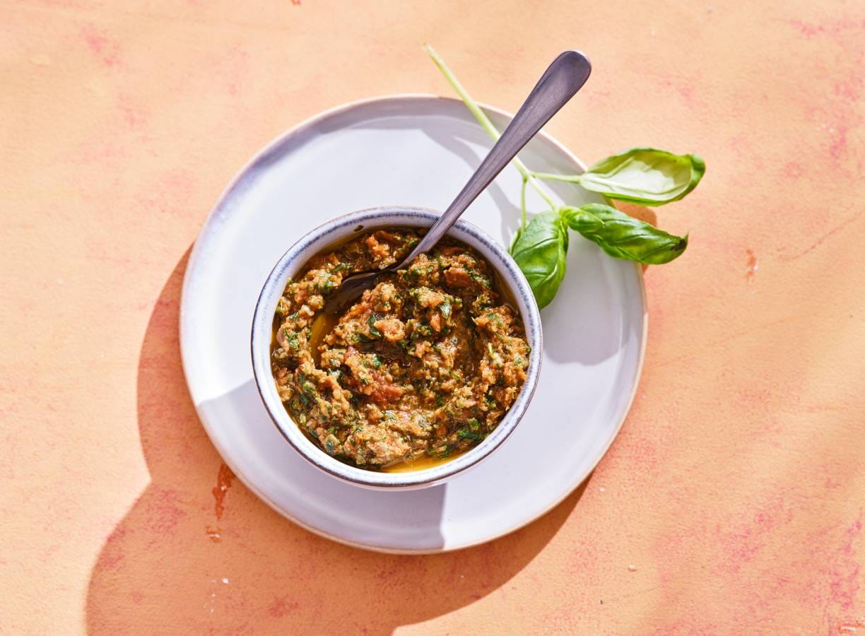 Snelle 'tapenade' van tomaat, basilicum en kappertjes