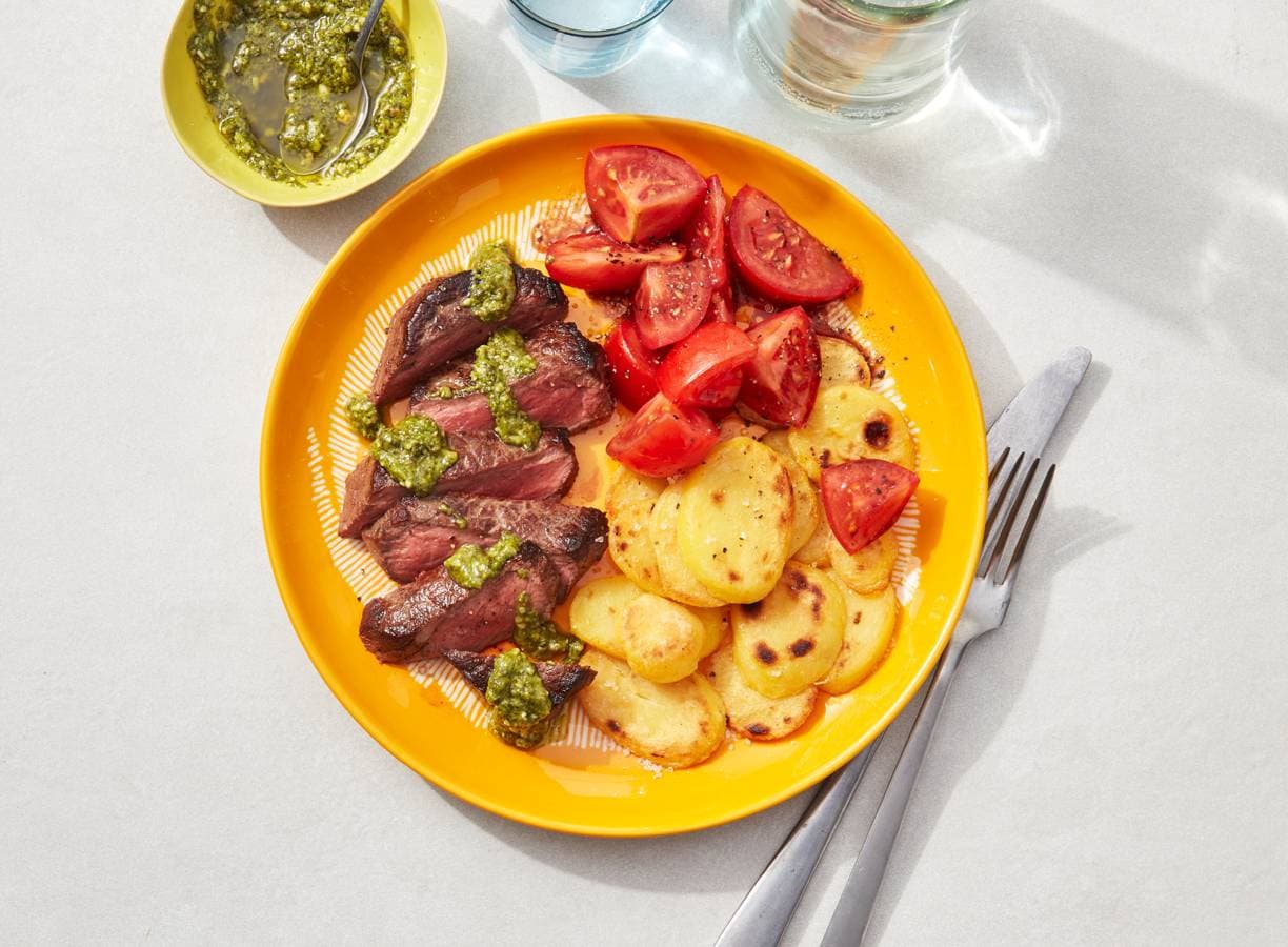 Wat hoort er bij biefstuk? Gebakken aardappeltjes natuurlijk. Extra zonnig met pesto en tomatensalade.