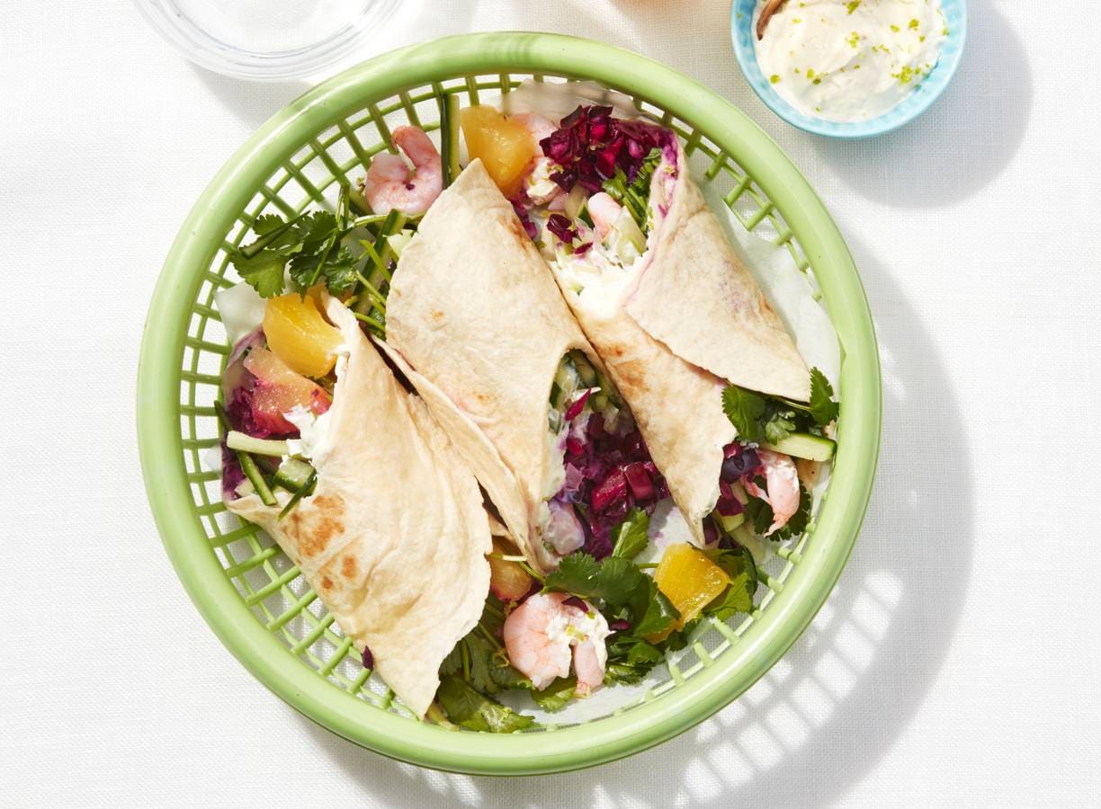 Eet deze wraps met garnalen, ananas en crème fraîche bij voorkeur op de camping of in het park.