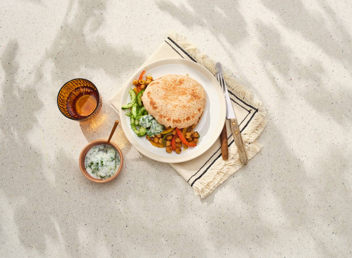 Verhit ondertussen de rest van de olie in een hapjespan en bak de paprika ca. 3 min. op hoog vuur. Voeg de kikkererwten, ras el hanout en de gesneden knoflook toe en bak ca. 7 min. op middelhoog vuur mee. Breng op smaak met peper en eventueel zout. Serveer met de pitabroodjes, tzatziki en komkommersalade.