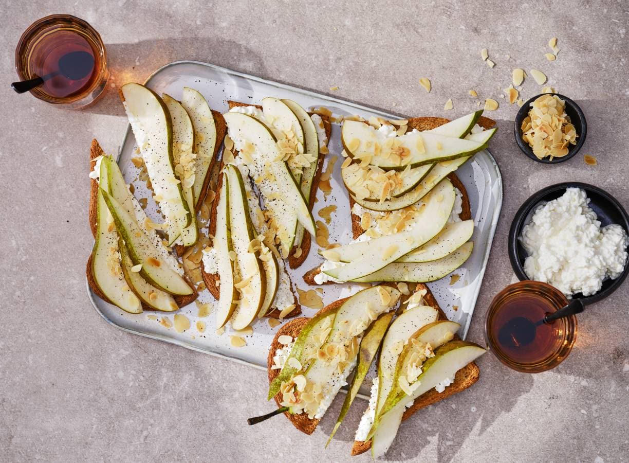 Besmeer de sneetjes brood met de cottagecheese en verdeel de peer erover. Bestrooi met het amandelschaafsel en breng op smaak met versgemalen peper.