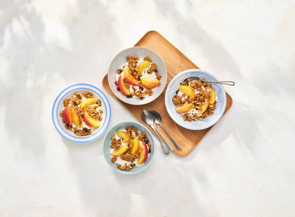 Verdeel de yoghurt over kommen en verdeel de parten appel erover. Bestrooi met de pangranola.