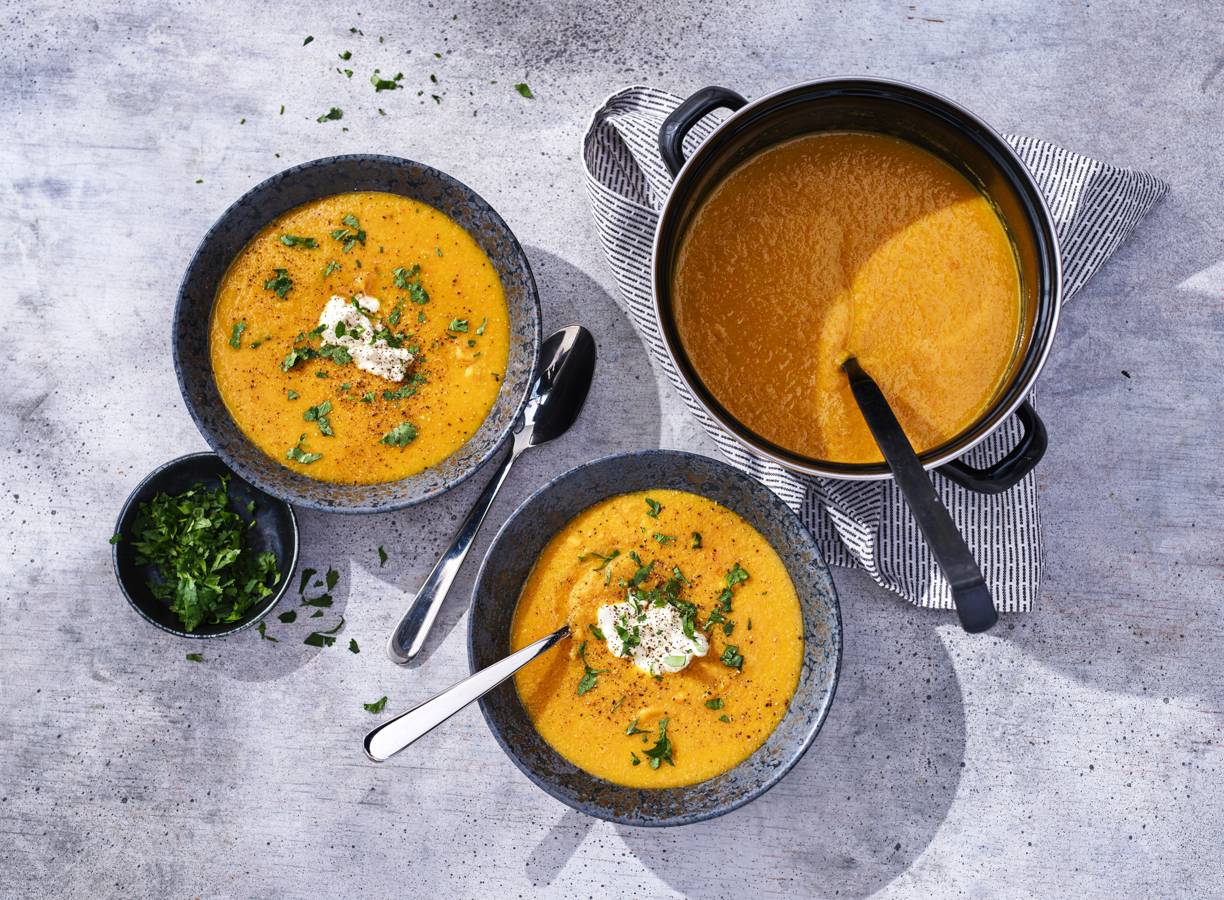 Een gezond soepje met pompoen, wortel, linzen en ricotta. Dat is genieten zonder na te denken.