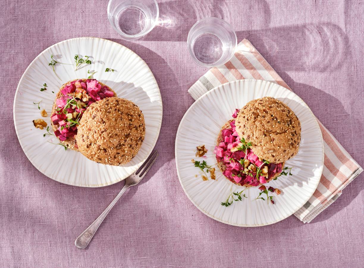 Volkorenbroodje met romige bieten-appelsalade