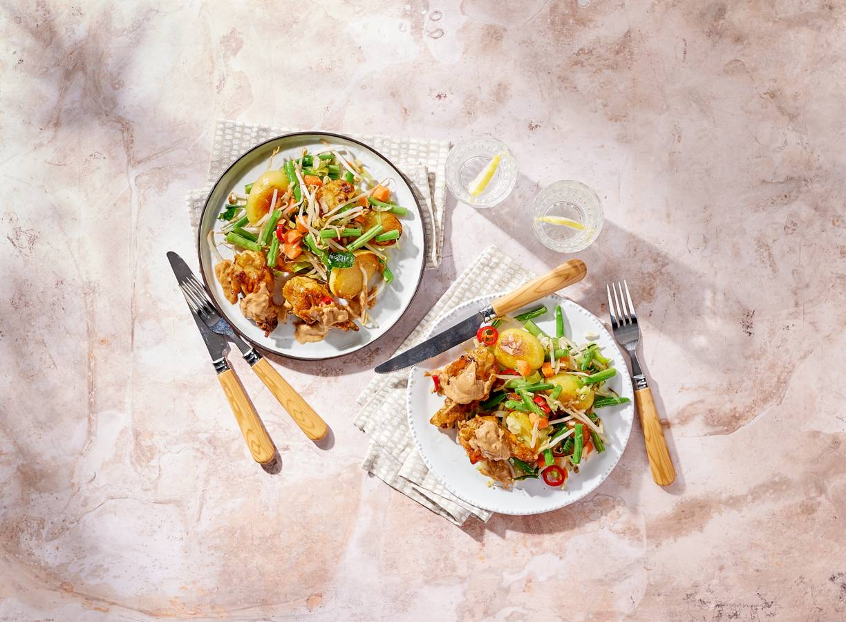 Serveer de kip met de geroerbakte aardappelen en groente.