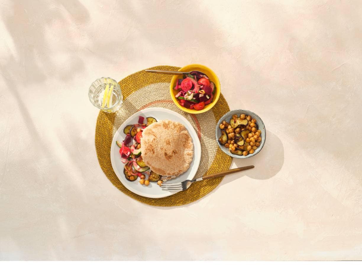 Pita met kikkererwten en aubergine, ricotta en salade