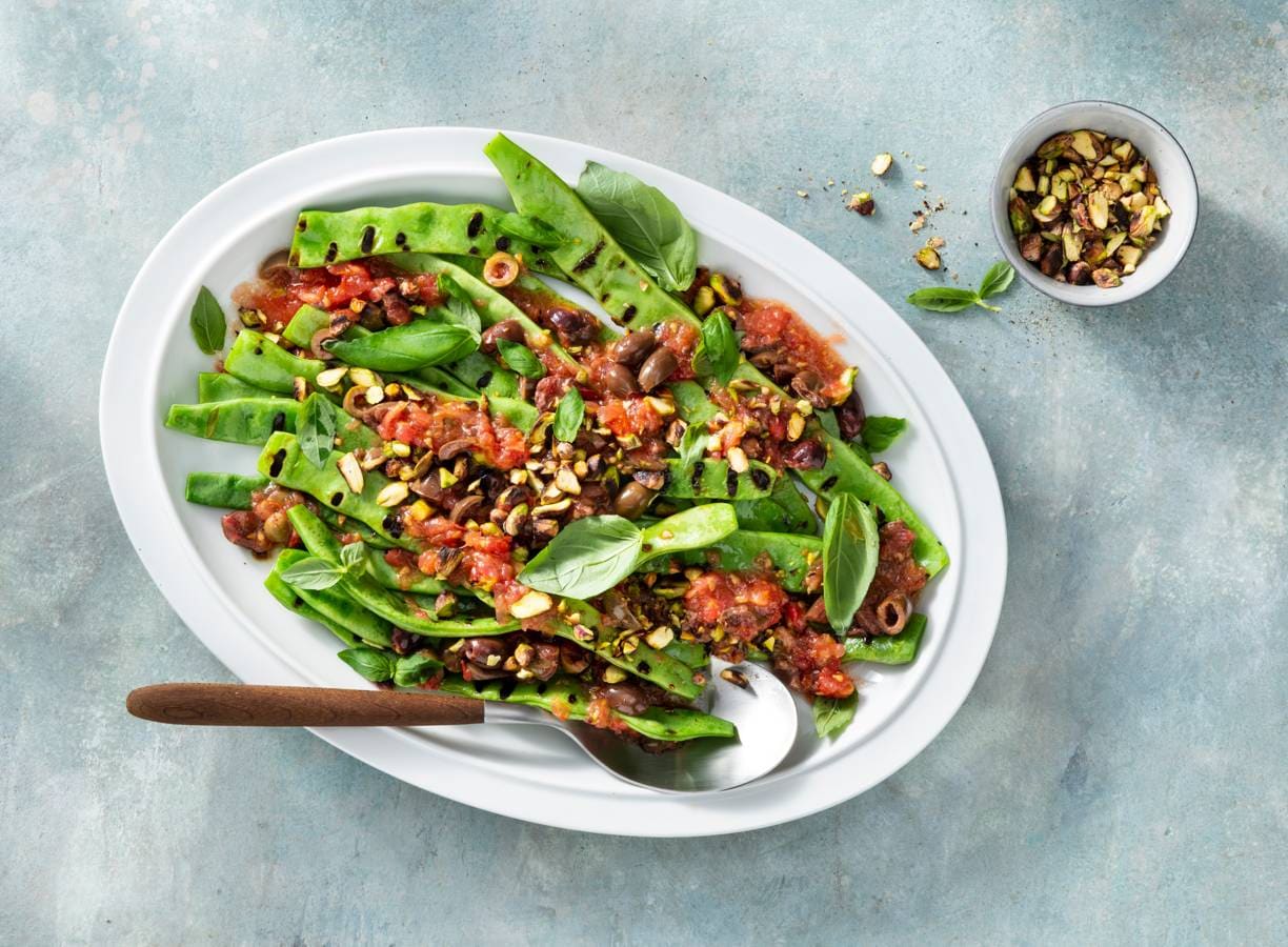 Salade met gegrilde snijbonen, tomatendressing en pistache