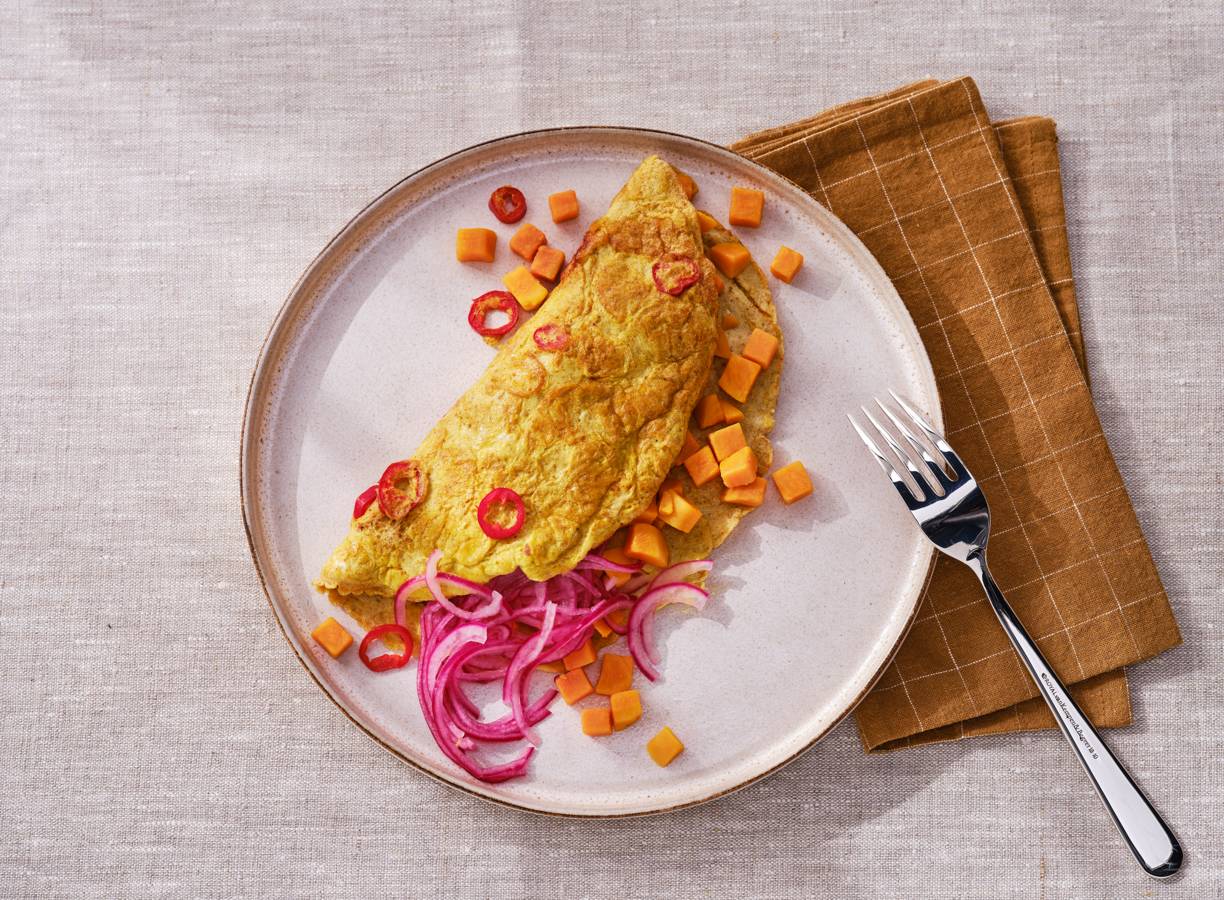 Kerrie-omelet met zoete aardappel en ingelegde rode ui