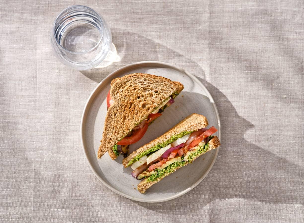 Broodje net even anders. Dat is deze sandwich met rucolaspread, gegrilde groenten en mozzarella.