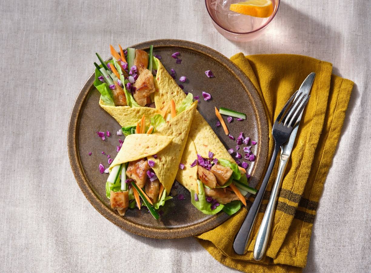 Verdeel de blaadjes sla, kipstuckjes, peen, komkommer en rodekool over de wraps. Rol de wraps op, snijd diagonaal door en serveer.